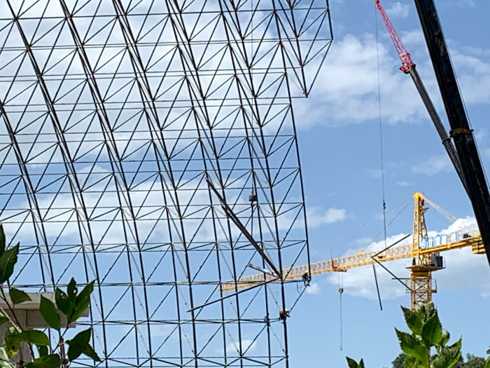 (4)本工程網(wǎng)架采用“山墻起步+錐體高空散裝法”進(jìn)行安裝,即先安裝1軸山墻網(wǎng)架(含相鄰跨網(wǎng)架)作為整個(gè)網(wǎng)架的起步網(wǎng)架,然后從起步網(wǎng)架開(kāi)始依次往17軸方向?qū)W(wǎng)架進(jìn)行高空散裝,***后安裝17軸山墻網(wǎng)架,***終安裝完成整個(gè)網(wǎng)架。